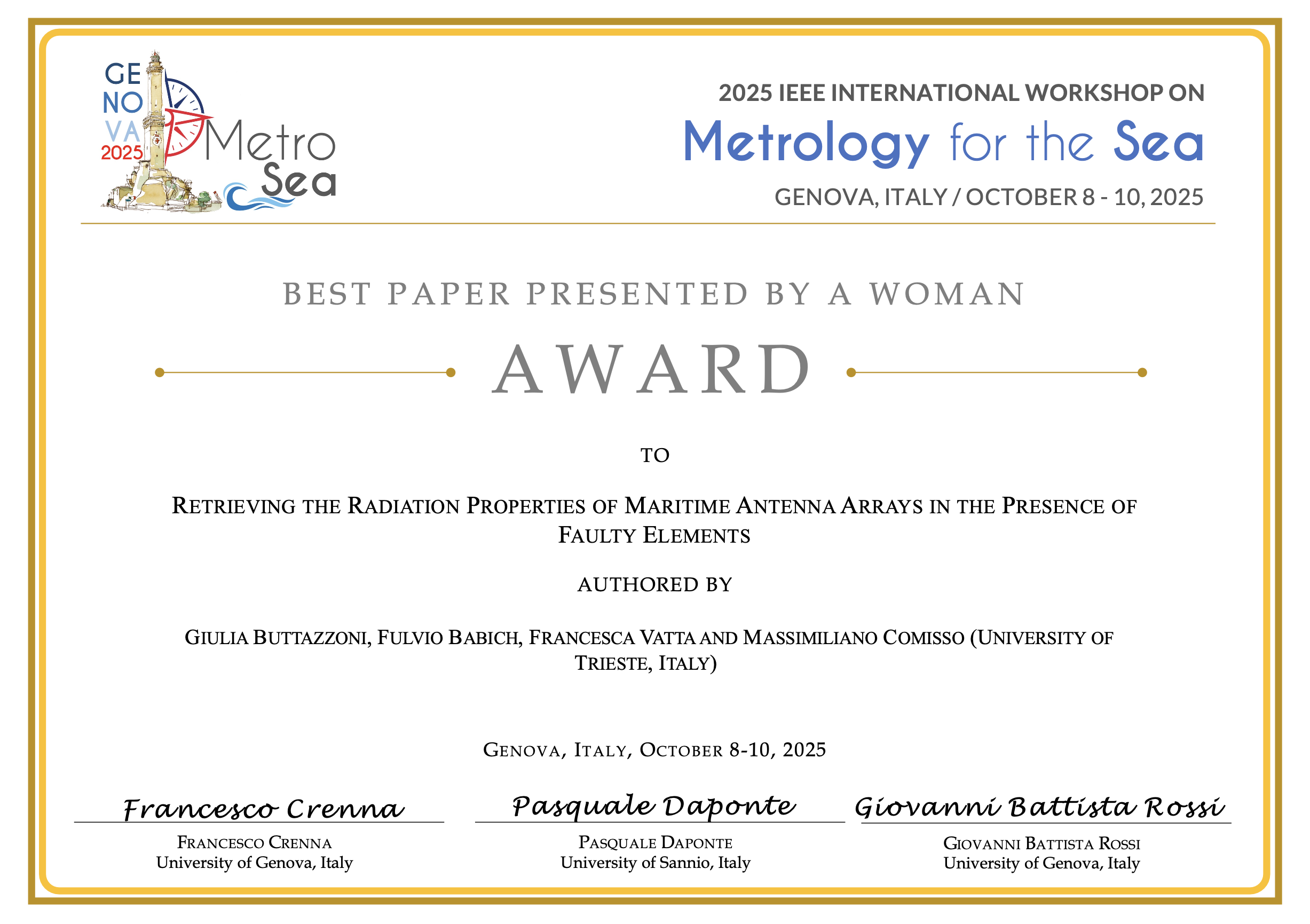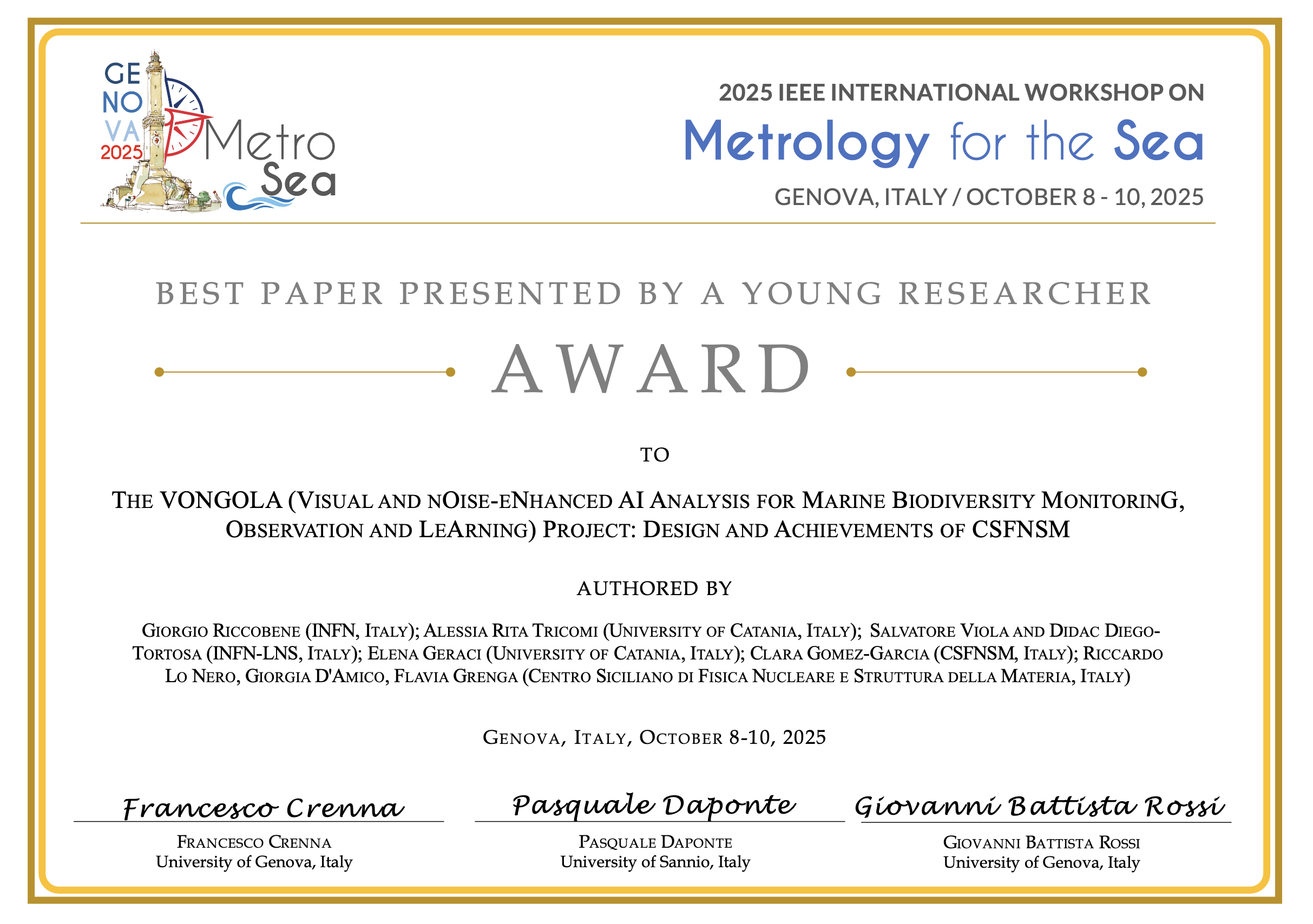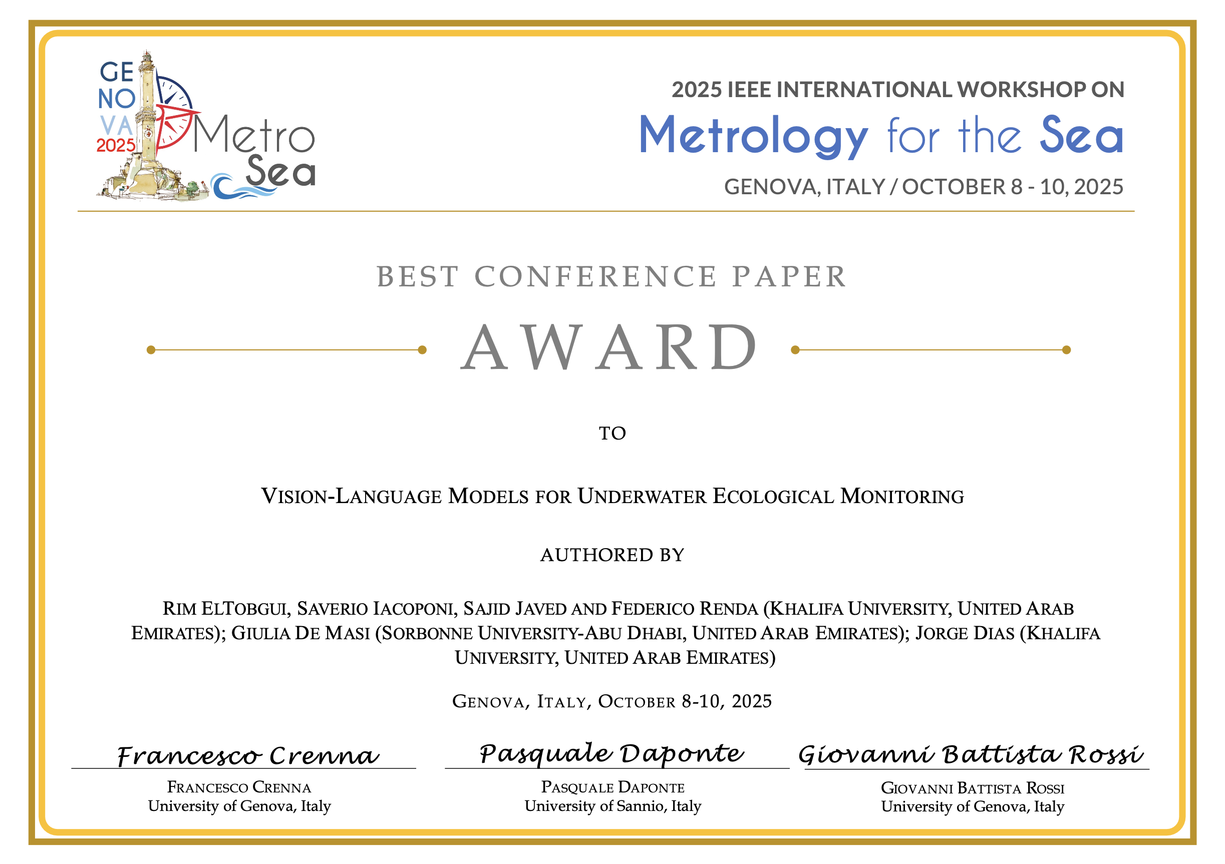 This award recognizes the most outstanding paper presented at IEEE MetroSea 2025.