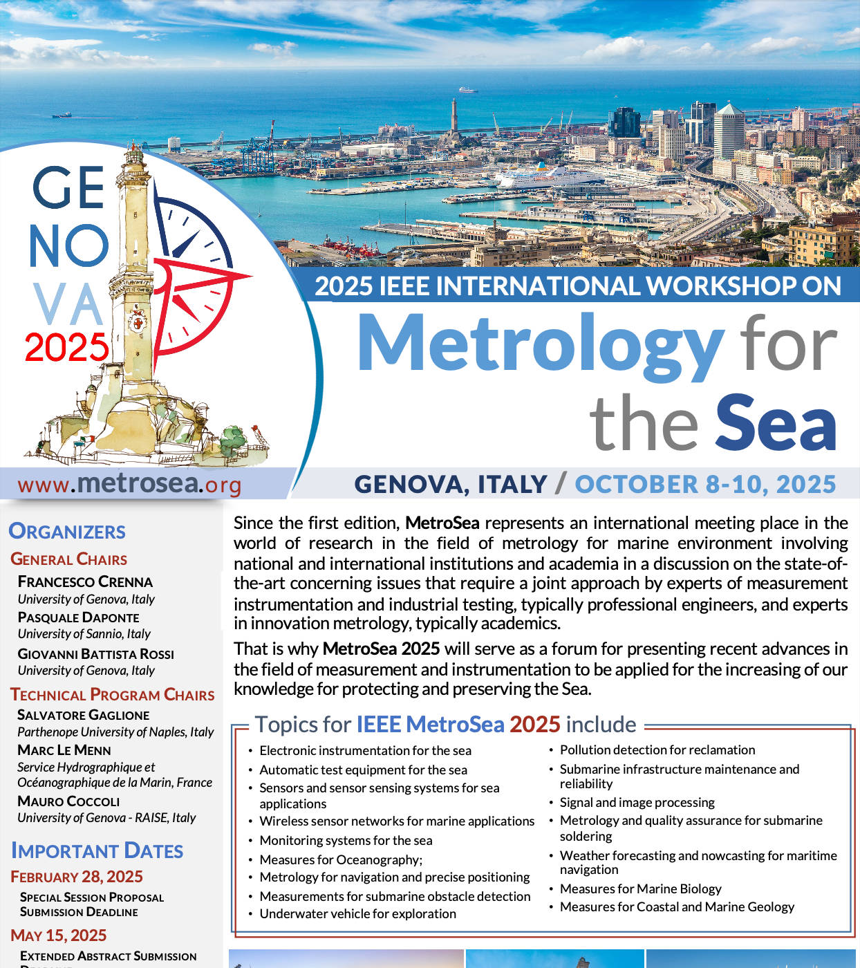 IEEE MetroSea 2025 aims to gather people who work in developing instrumentation and measurement methods for the sea. Attention is paid, but not limited to, new technology for sea environment monitoring, metrology-assisted production in sea industry, ship component measurement, sensors and associated signal conditioning for the sea, and calibration methods for electronic test and measurement for marine applications.