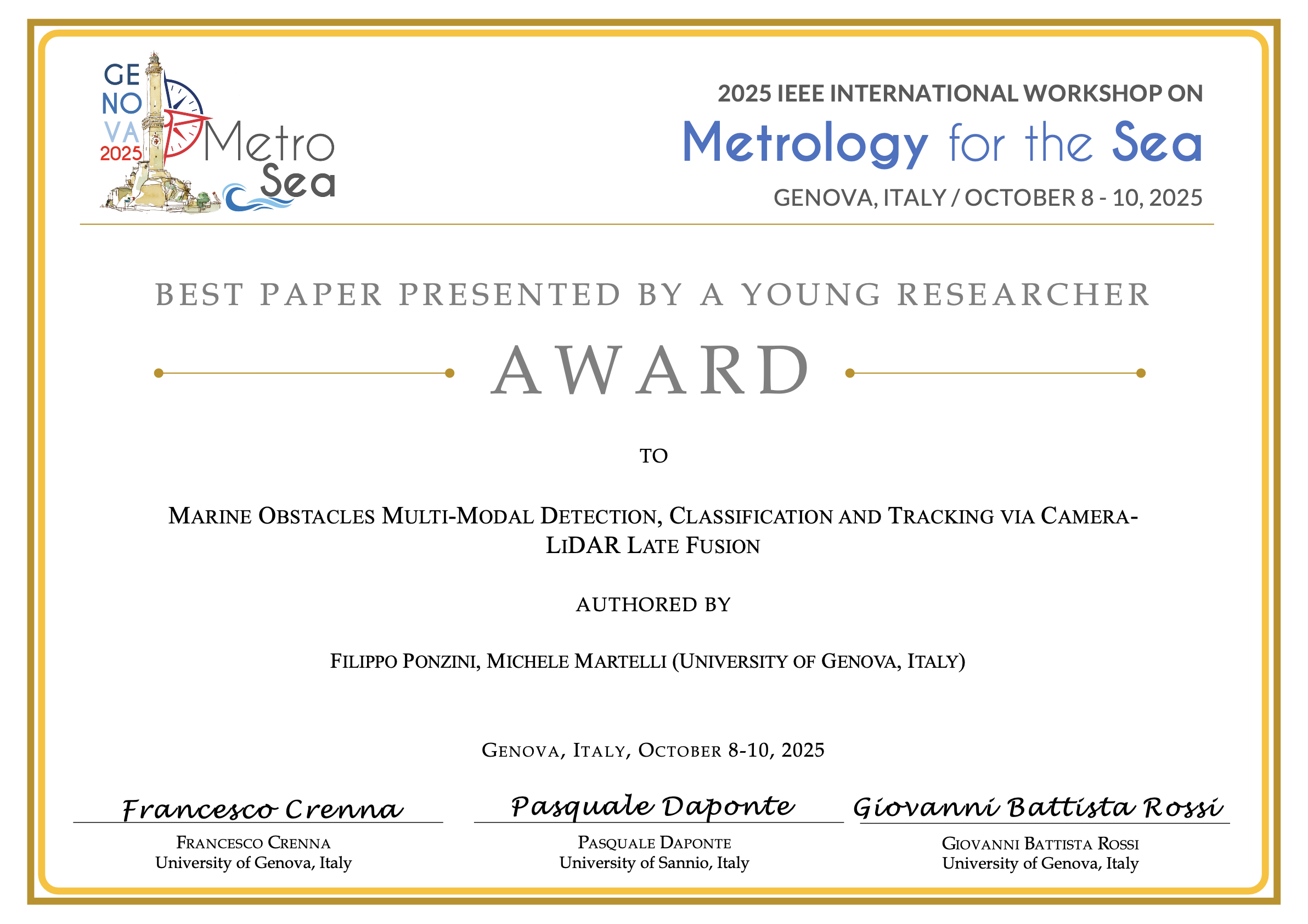 IEEE MetroSea 2025 will have the following awards, which will be announced and bestowed at the Award Ceremony.
